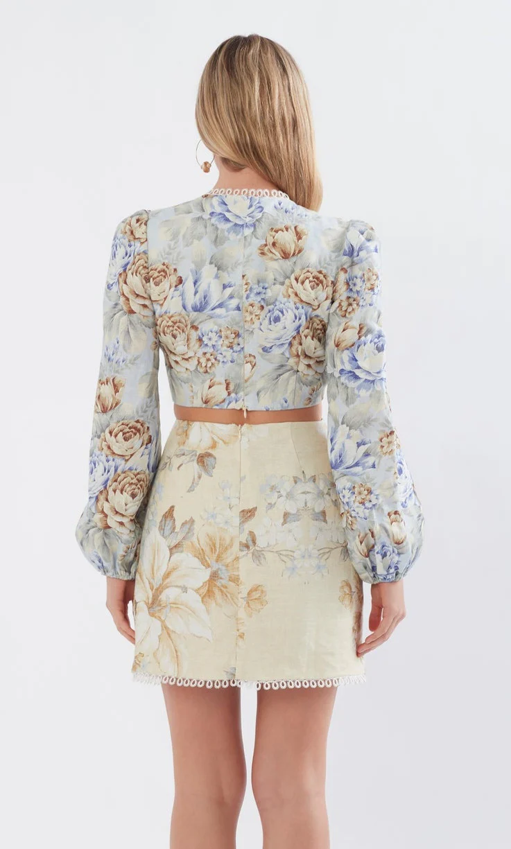 Cut from lightweight linen and decorated with our contrasting Botanica prints, the cut out mini dress features breezy blouson sleeves and A-line skirt with lace trim. The plunging cutout neckline is held in place by a unique branded brass ring in brushed gold, providing support for all bust sizes.