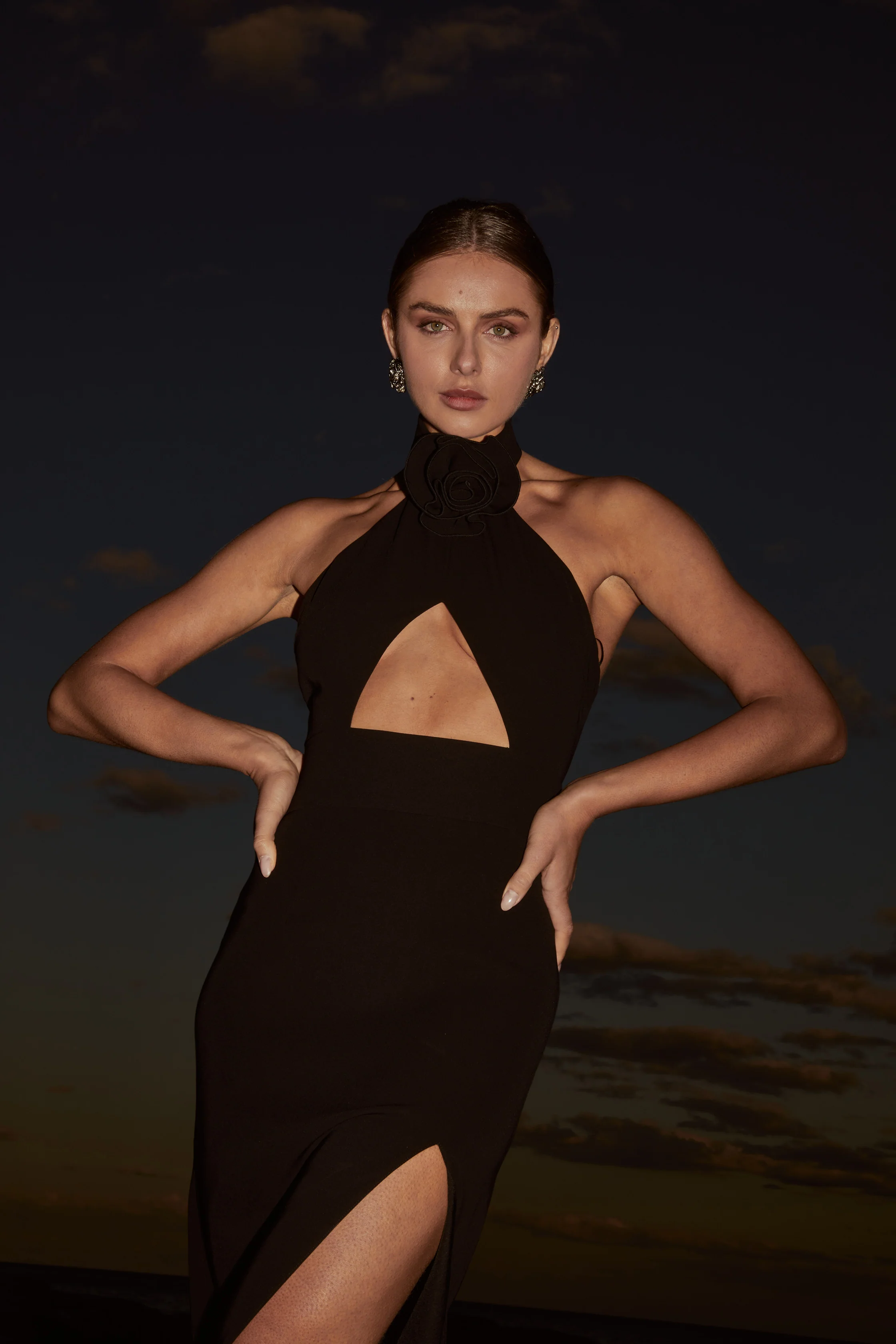 The unique silhouette of the Lilya Dress is balanced with a bold cutout, thigh-high split and a sophisticated high neck with a removable floral appliqué. Prepare to stun in this dress.