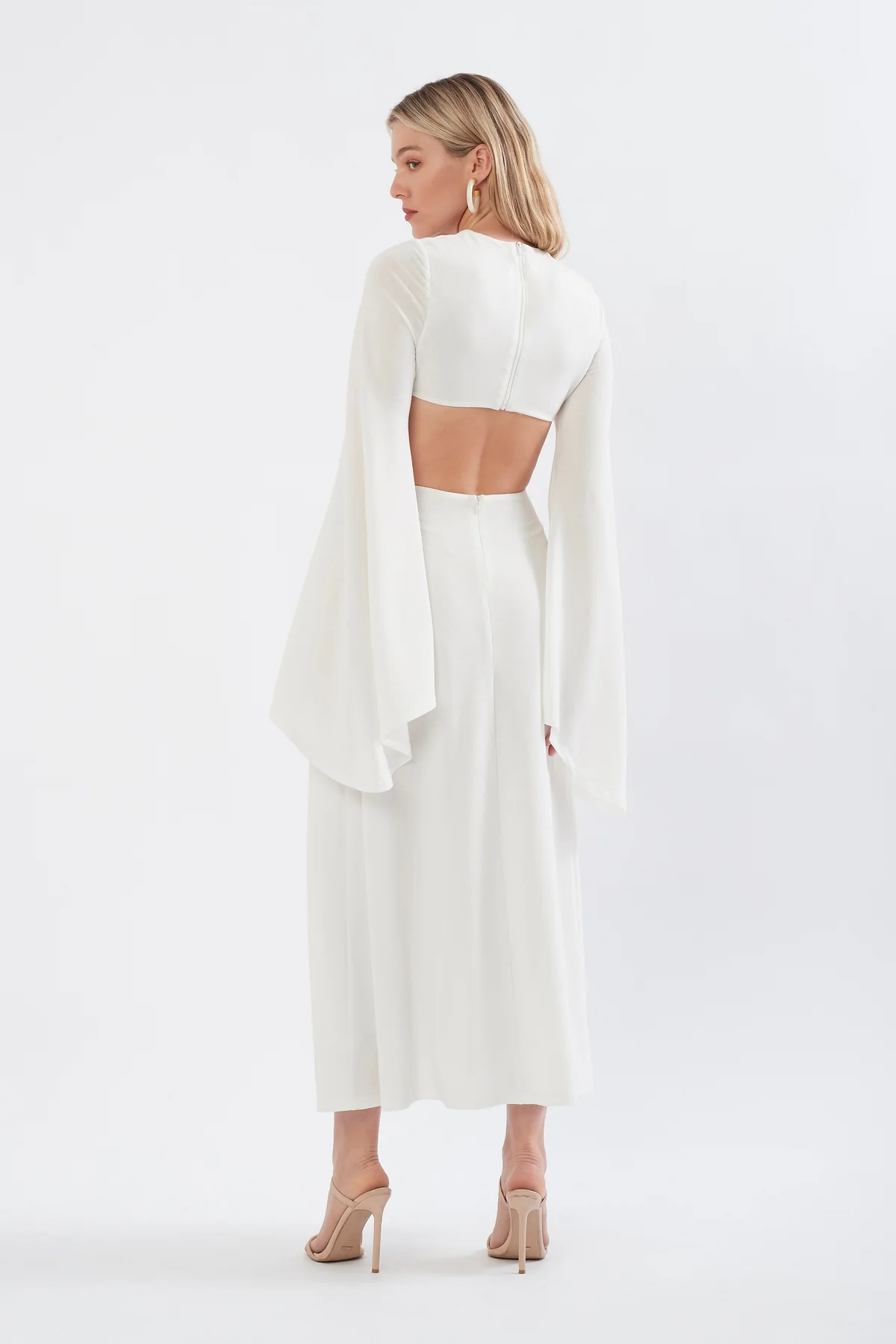 With it’s elegance-exuding neckline and dramatic cut-outs, this dress demands attention from first glance. This sophisticated dress is cut from a lightweight lux stretch knit fabric that hugs the body in all the right places. Featuring side cutouts that add a hint of graceful sensuality. The classic round-neck gives way to the exaggerated sleeves. Gathered at the front with a branded brass ring in brushed gold. Prepare to stun.