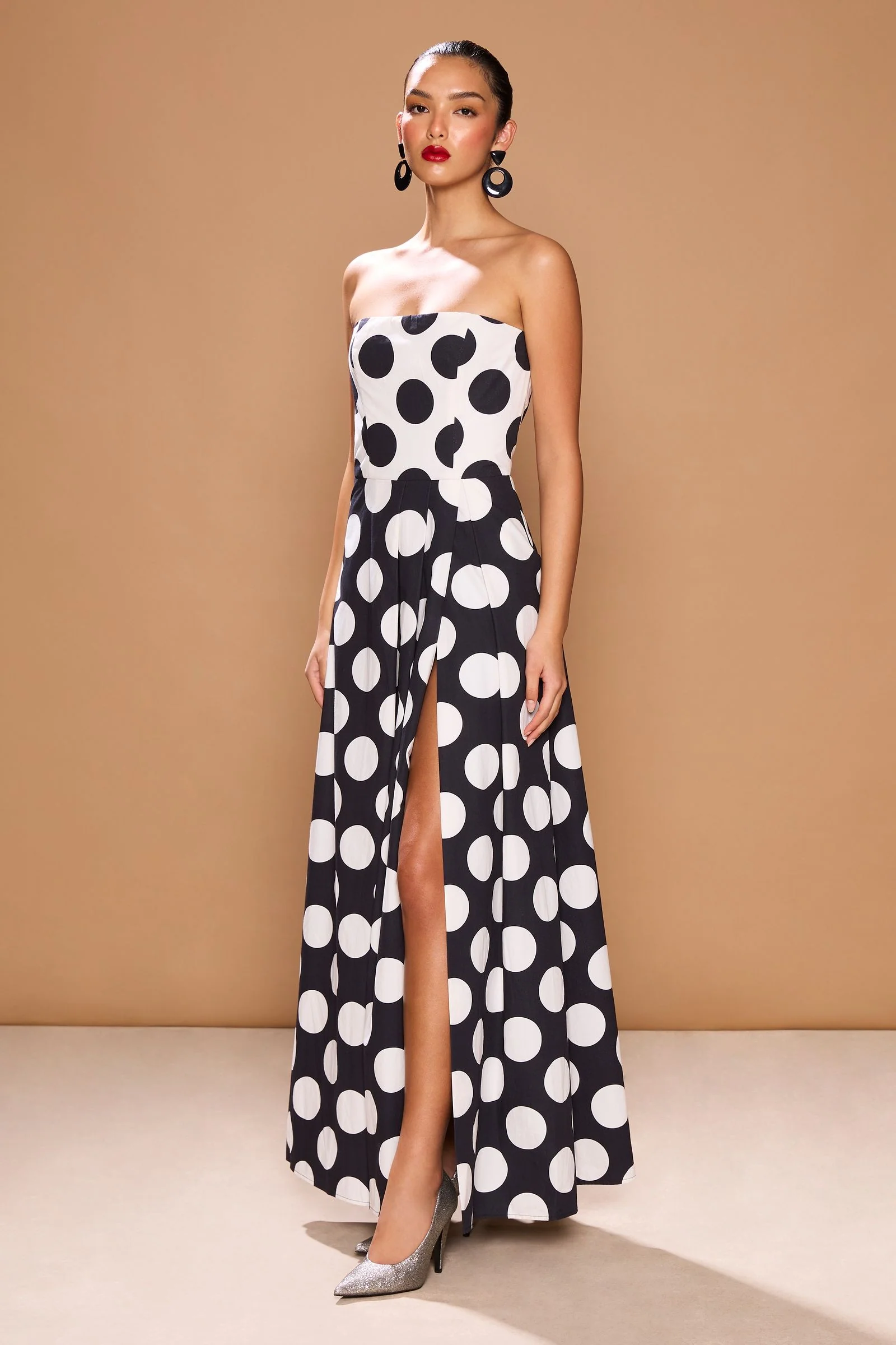A captivating blend of retro charm and modern elegance, Milano is a strapless floor length gown that features skin-baring décolletage and a fitted bodice that gracefully flatters the figure. The dress flows seamlessly into a pleated A-line skirt that offers freedom of movement and a whimsical touch, featuring a high split in the left leg, adding a touch of drama.