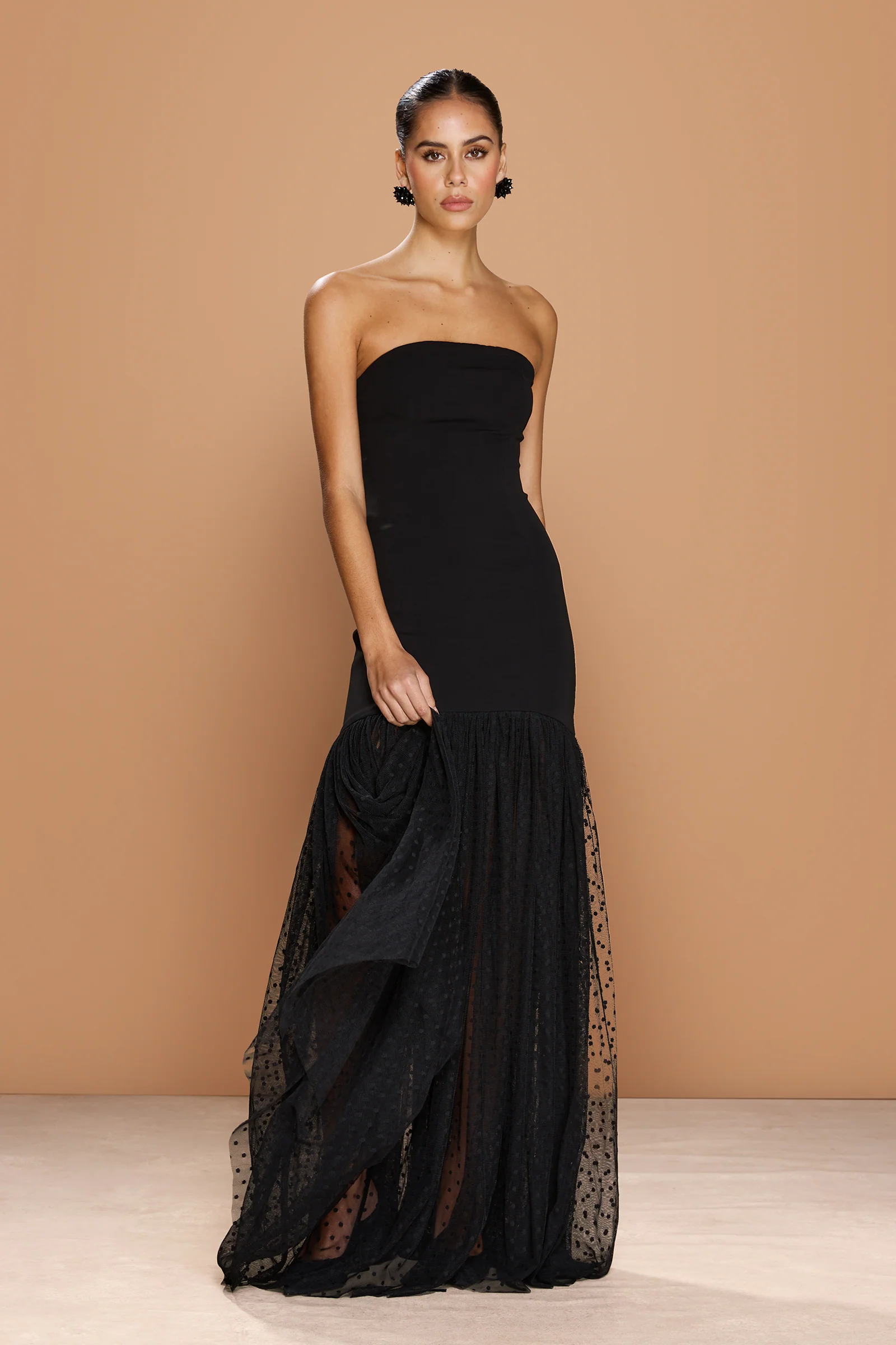 Make an entrance in the Nayla Gown. A maxi length gown, featuring a fitted drop waisted bodice and a gathered polka-dot tulle skirt. A classic, timeless evening dress designed to be worn with and without straps.