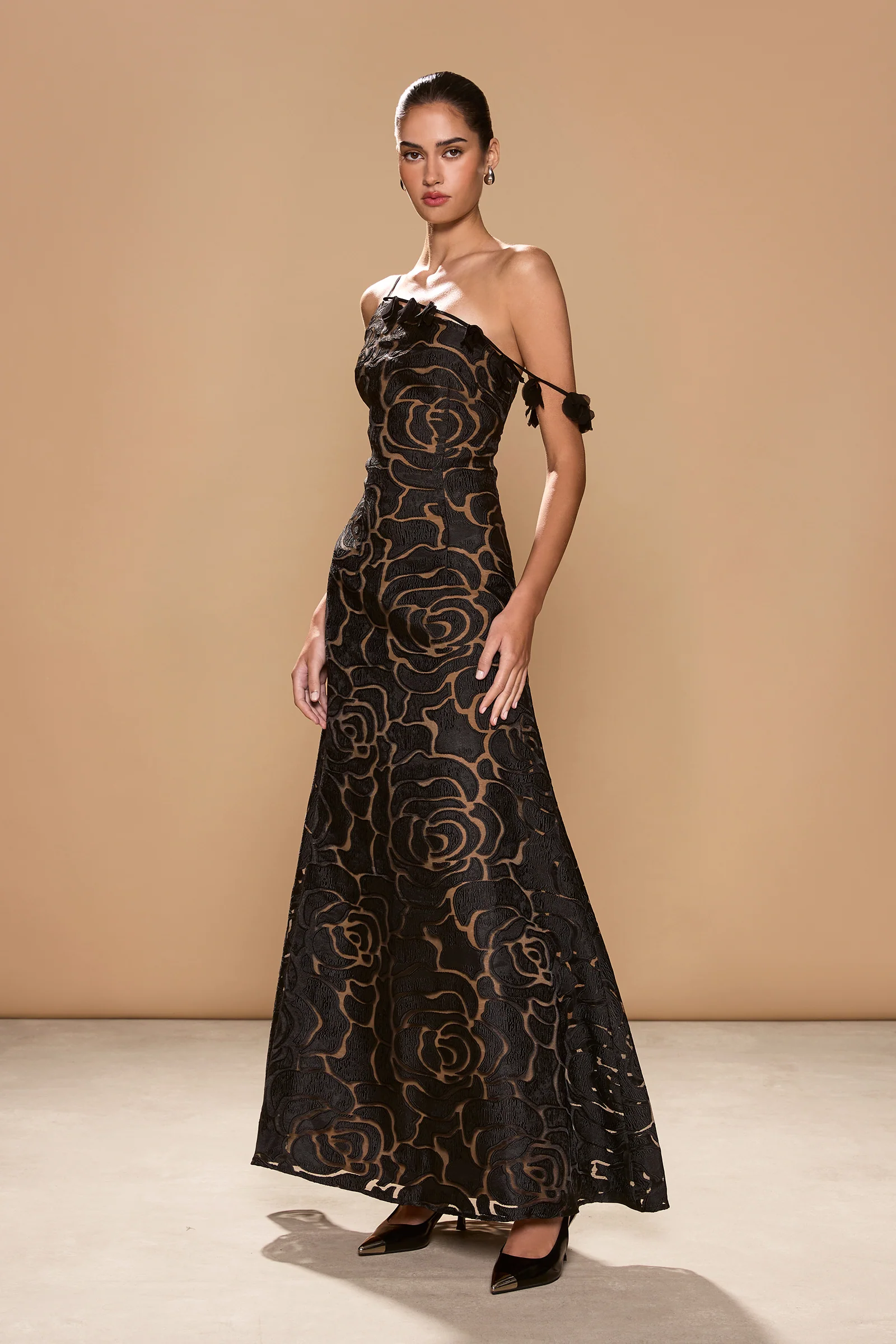 The Paloma Gown is a breathtaking statement piece, crafted from intricate floral lace for a romantic and elegant look. Featuring an asymmetrical one-shoulder design with delicate petal detailing, this gown gracefully flows into a floor-sweeping silhouette, exuding timeless sophistication for unforgettable impression.