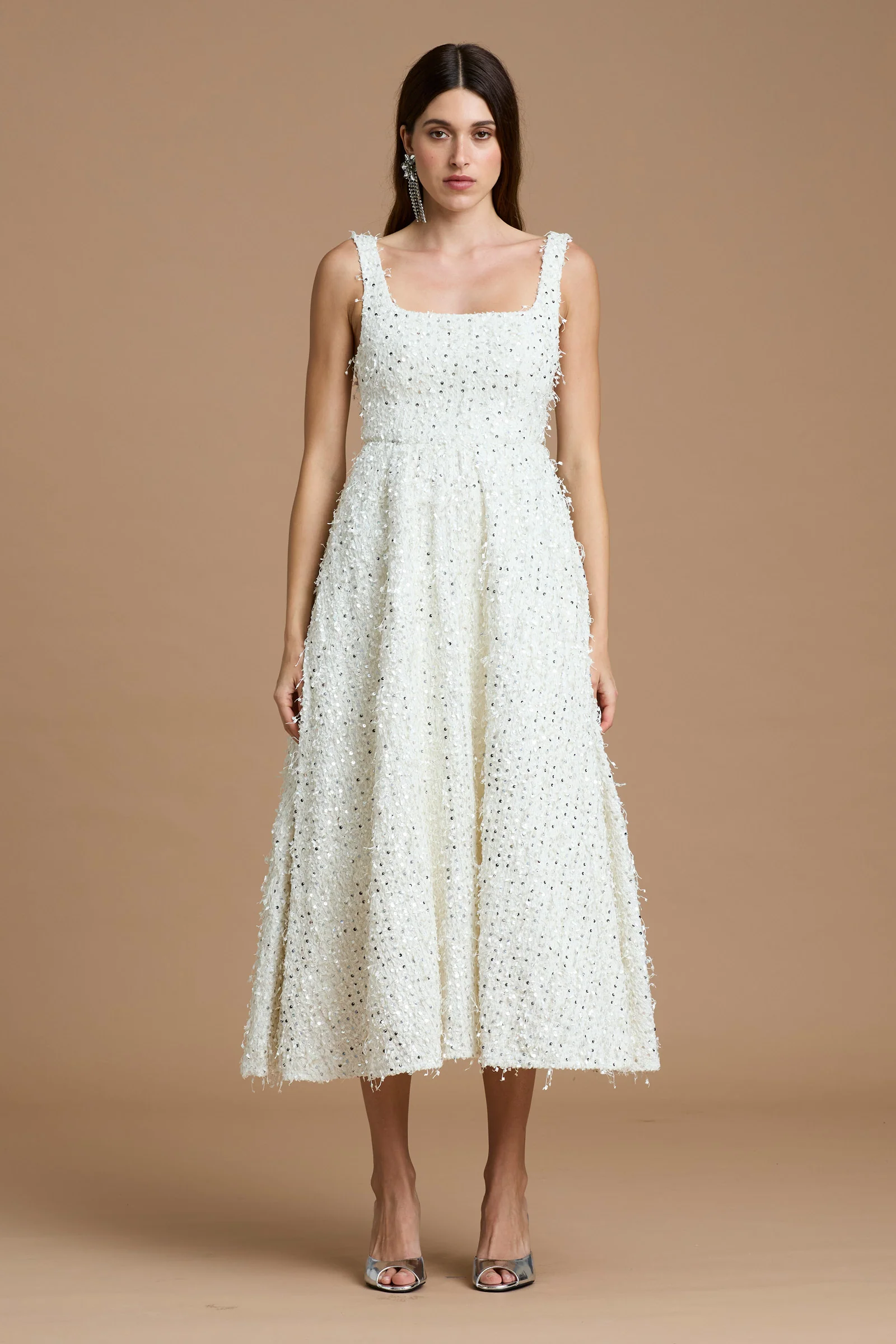 Effortlessly graceful, we introduce the Valentino Midi Dress. Designed for the classic muse, Valentino features a classic square-neckline with a full midi skirt with tulle lining. Cut from an embellished fabric with a boned bodice.